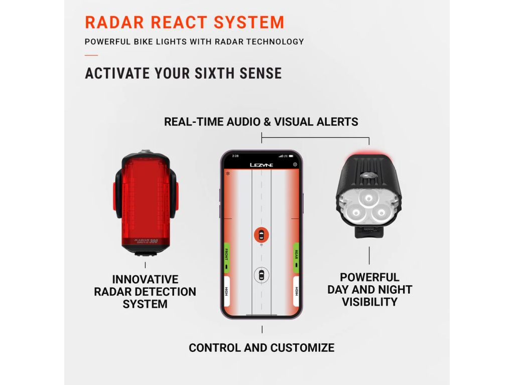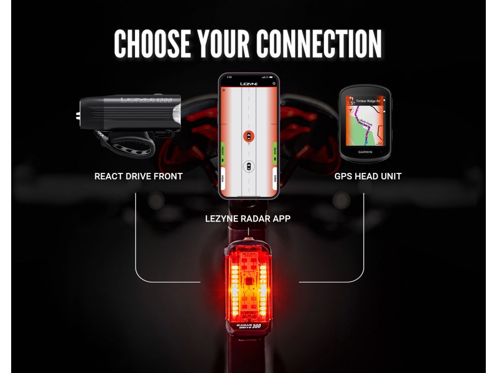 Radar Drive je připevněn vzadu a nepřetržitě snímá prostor za kolem. Jakmile se zpoza přiblíží vozidlo, informace je bezdrátově odeslána do React Drive vpředu. Přední světlo pak vydá zvukové upozornění a LED indikátory na jeho těle zábleskově signalizují situaci za zády. Upozornění jsou dostupná také prostřednictvím aplikace Lezyne Radar Ally nebo kompatibilního GPS cyklopočítače(např. Garmin) – záleží na tom, co kdo preferuje. Pro první spárování světel je potřeba chytrý telefon, pak už systém pracuje zcela autonomně.