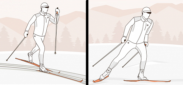 U lyží na klasiku se skinovými pásy posunutí vázání vpřed (hodnoty 1, 2) více zatíží mohérové pásy a zajistí vám jistější a snadnější odraz. Naopak posunutí vzad (hodnoty -1, -2) posune těžiště celé lyže dozadu, odlehčí tak pásy a zlepší skluz.