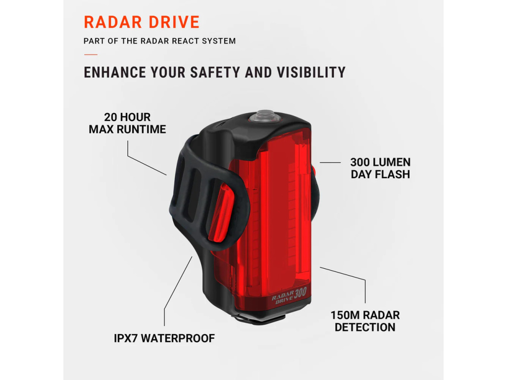 Silniční cyklisté oceňují radarovou detekci vozidel při jízdě na frekventovaných silnicích a denní blikání 300 lumenů pro maximální viditelnost za denního světla.